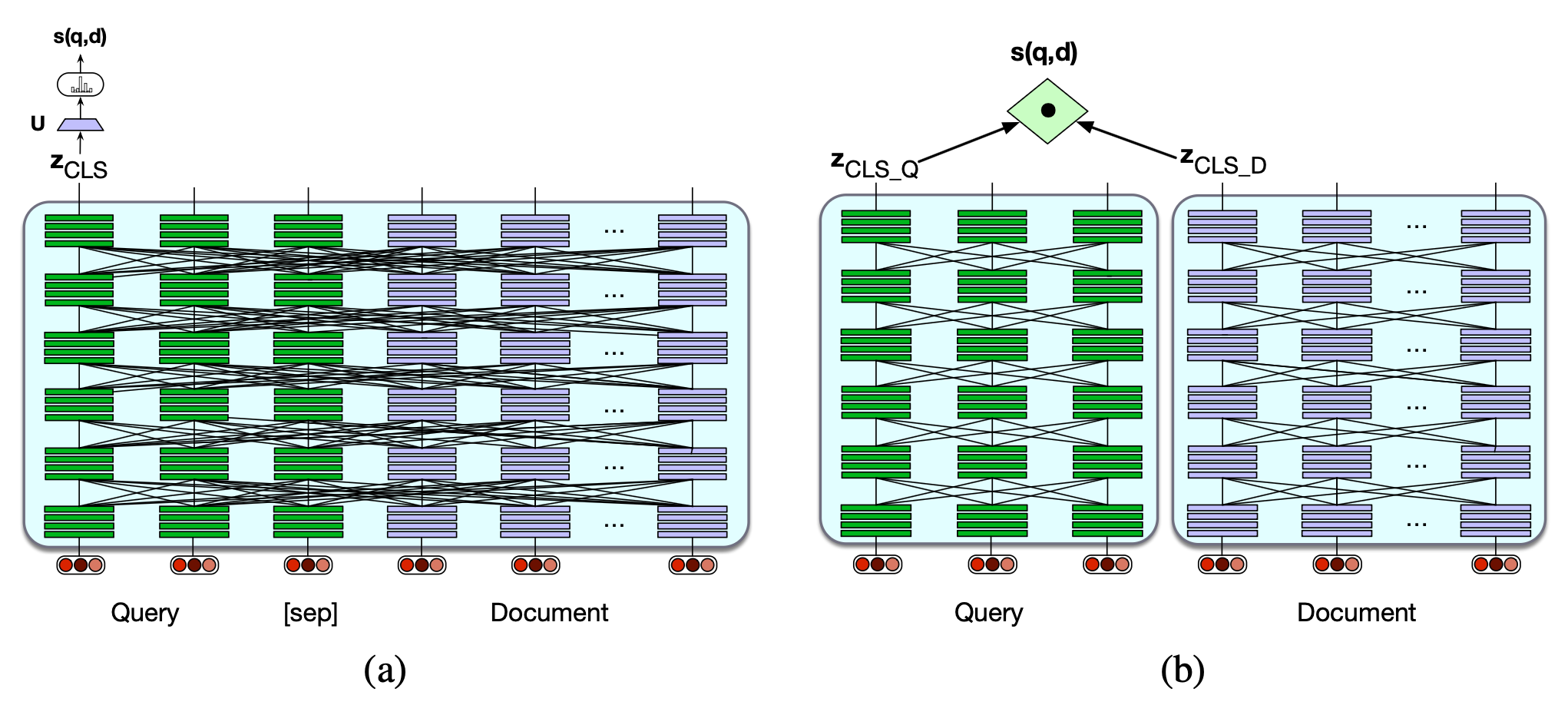 (b) 使用独立的查询编码器和文档编码器,通过两者 [CLS] 输出向量的点积作为得分。此方法计算高效,但精度略低。