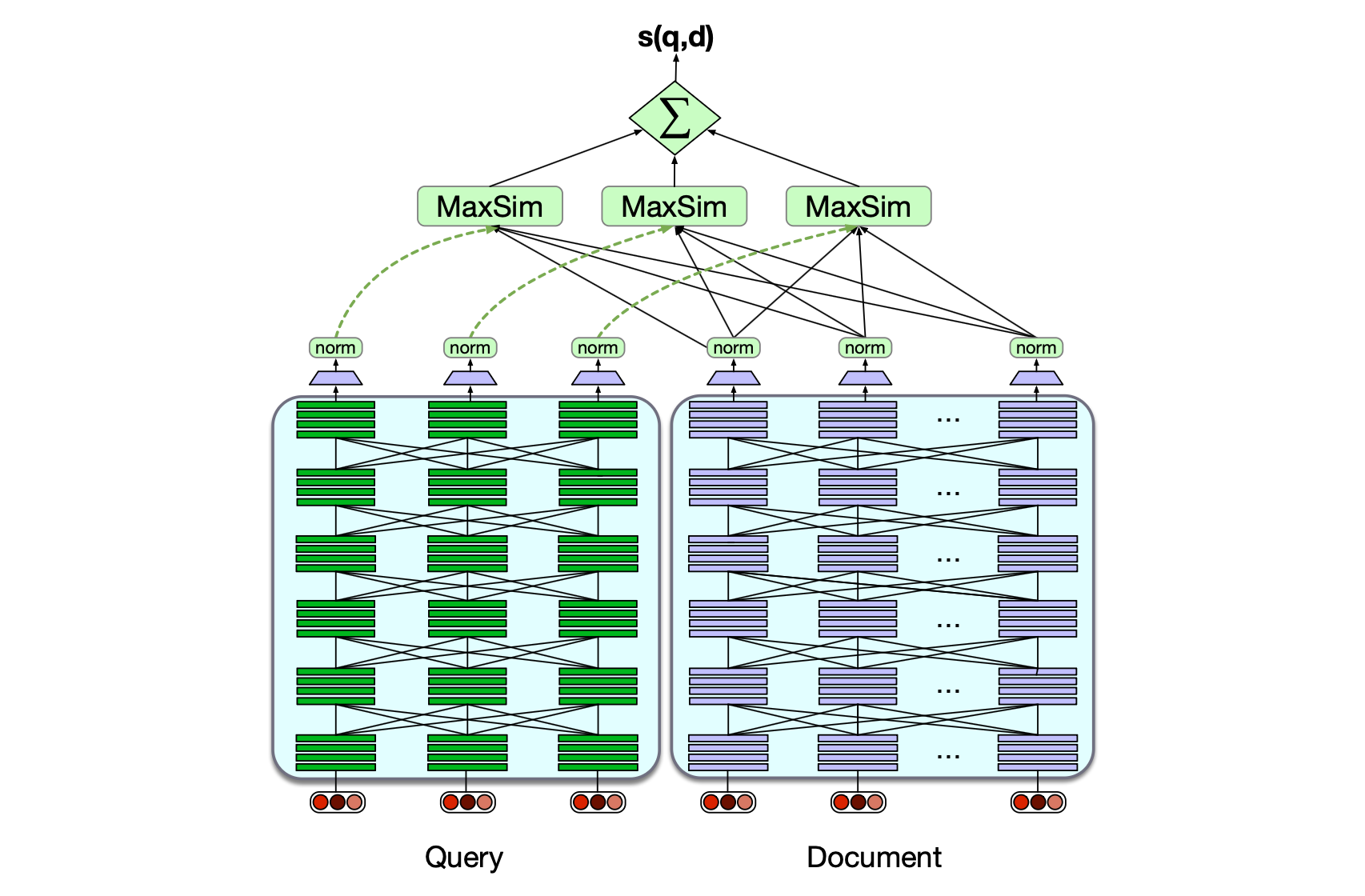(图中省略了一些细节;例如查询前会添加 [CLS] 和 [Q:] 标记,文档前添加 [CLS] 和 [D:] 标记。图改编自 Khattab 和 Zaharia, 2020。)