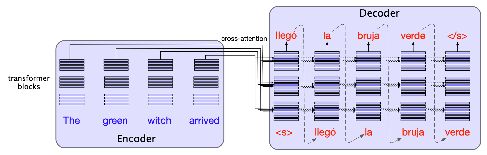 也就是说,在标准的多头注意力中,每个注意力层的输入是 $\mathbf{X}$,而在交叉注意力中,输入则是编码器的最终输出 $\mathbf{H}_{enc} = \mathbf{h}_1, \dots, \mathbf{h}_n$。 $\mathbf{H}_{enc}$ 的形状为 $[n \times d]$,其中每一行对应一个输入词元。为了将来自编码器的键(keys)和值(values)与来自解码器前一层的查询(query)关联起来,我们将编码器输出 $\mathbf{H}_{enc}$ 分别与交叉注意力层的键权重 $\mathbf{W^K}$ 和值权重 $\mathbf{W^V}$ 相乘。 而查询则来自解码器前一层的输出 $\mathbf{H}_{dec[\ell-1]}$,并乘以交叉注意力层的查询权重 $\mathbf{W^Q}$: