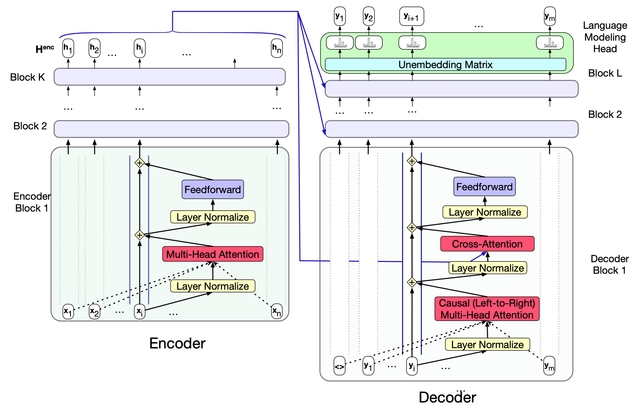 图 12.6 编码器与解码器的 Transformer 模块,以残差流视角展示。 编码器的最终输出 $\mathbf{H}_{enc} = \mathbf{h_1}, \dots, \mathbf{h}_n$ 作为上下文被送入解码器。 解码器本质上是一个标准的 Transformer,只是多了一个交叉注意力层,该层接收编码器的输出 $\mathbf{H}_{enc}$,并用它来构造自身的键($\mathbf{K}$)和值($\mathbf{V}$)输入。