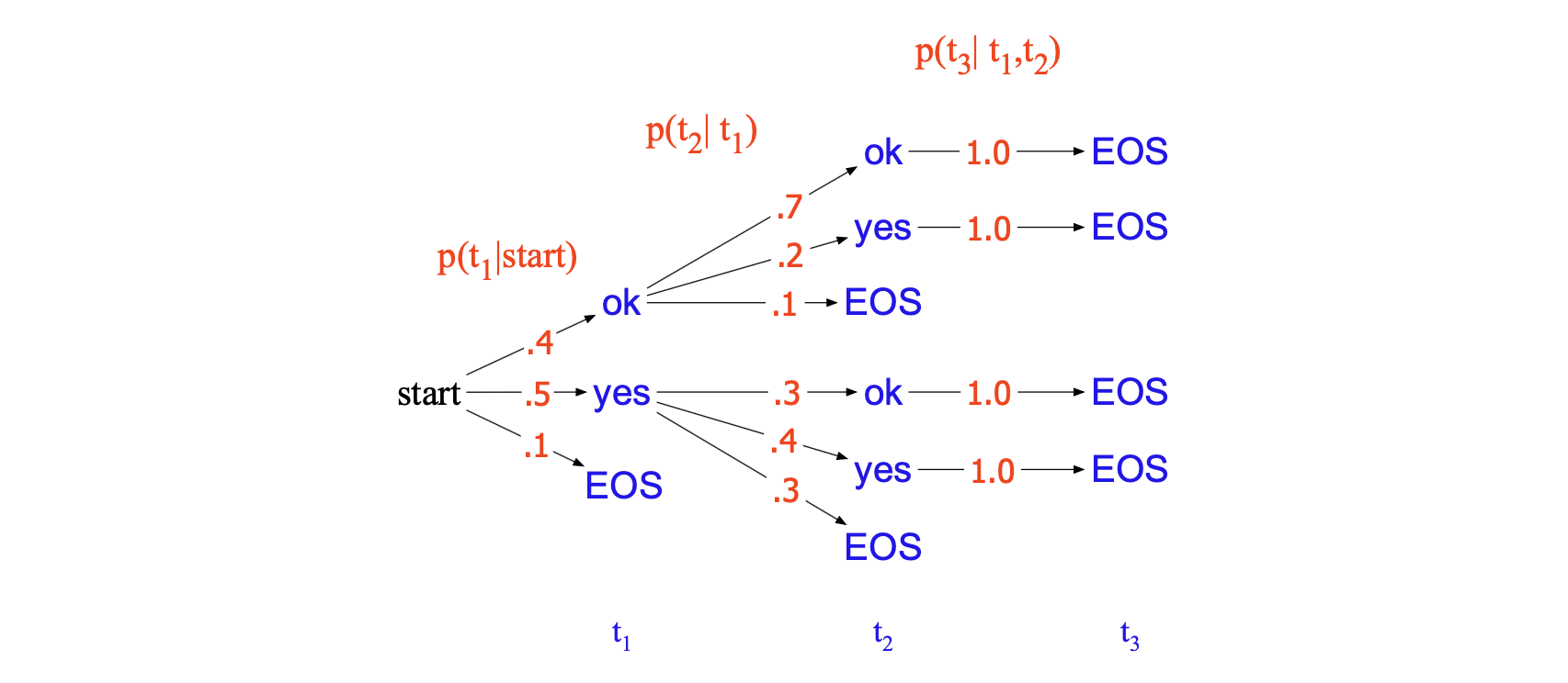 图 12.7 从词汇表 $V = \{\text{yes}, \text{ok}, \text{EOS}\}$ 中生成目标序列 $T = t_1, t_2, \dots$ 的搜索树,图中标注了从每个状态生成各词元的概率。 贪心搜索会选择 yes 后接 yes,而非全局概率最高的序列 ok ok。