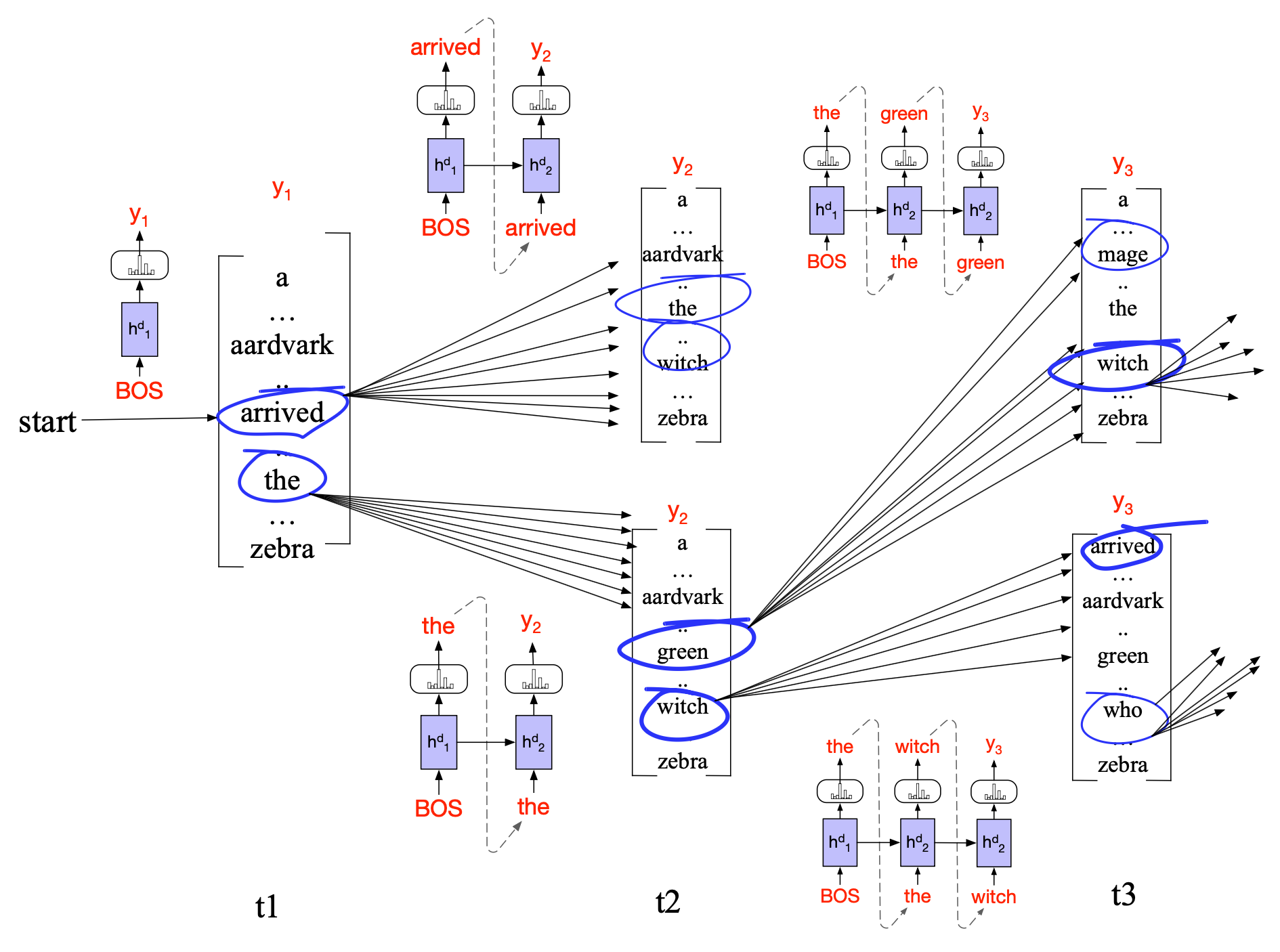 图 12.8 束宽 $k = 2$ 的束搜索解码过程。 在每个时间步,我们从当前前沿中选择 $k$ 个最佳假设,对每个假设生成 $V$ 种可能的扩展,对总共 $k \times V$ 个新假设进行评分,并保留其中最好的 $k = 2$ 个继续下一步。 在时间步 1,前沿包含从初始解码器状态中选出的两个最佳选项:“arrived” 和 “the”。 我们将它们分别扩展,计算所有新假设(“arrived the”、“arrived aardvark”、“the green”、“the witch”)的概率,并再次选出最好的两个(“the green” 和 “the witch”)作为新的搜索前沿。 图中弧线上的图像示意了每一步为评分下一个词所需运行的多个解码器(为简化起见,未画出交叉注意力部分)。