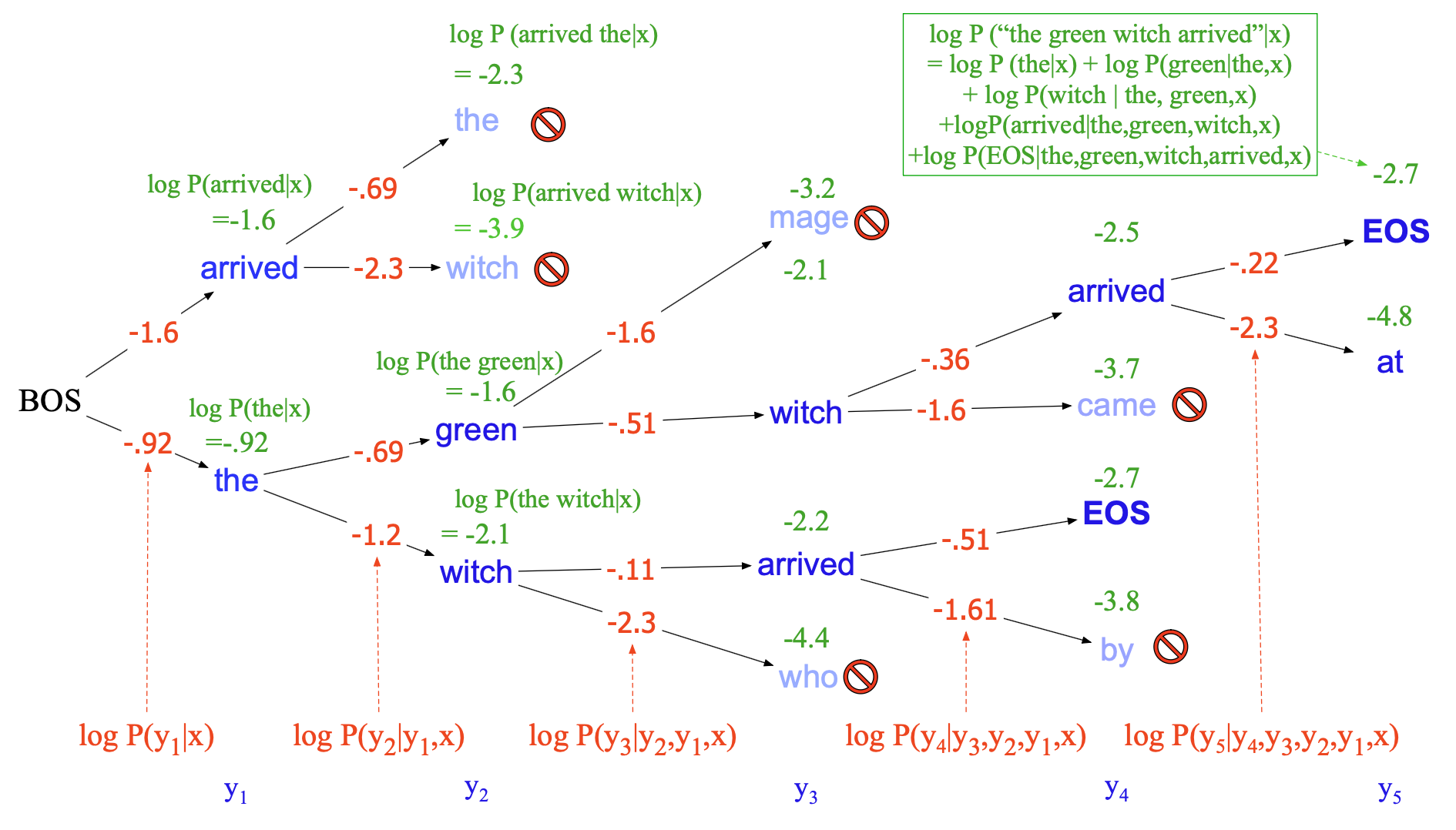 为了用对数概率对每个节点评分,我们利用概率的链式法则将 $P(y \mid x)$ 分解为每个词在其上下文条件下概率的乘积,并将其转换为对数之和(对于长度为 $t$ 的输出序列):