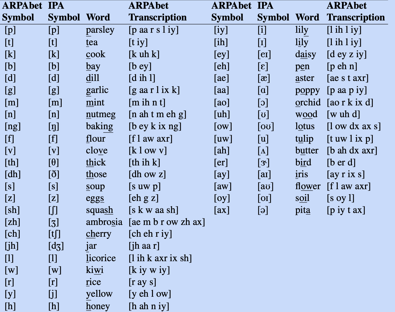 音素主要分为两大类:辅音(consonants) 和 元音(vowels)。 这两类声音都是通过气流在口腔、咽喉或鼻腔中运动而形成的。 辅音是通过某种方式限制或阻塞气流而产生的,可以是浊音,也可以是清音。 元音的阻碍较少,通常是浊音,且一般比辅音更响亮、持续时间更长。 这些术语在语言学中的技术用法与日常用法大致相同: [p]、[b]、[t]、[d]、[k]、[g]、[f]、[v]、[s]、[z]、[r]、[l] 等属于辅音; [aa]、[ae]、[ao]、[ih]、[aw]、[ow]、[uw] 等属于元音。 半元音(semivowels)(如 [y] 和 [w])兼具两类特征:它们像元音一样是浊音,但又像辅音一样短暂且不具备明显的音节性。