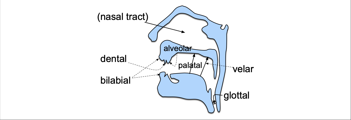 由于辅音是通过限制气流产生的,我们可以根据其最大限制点——即发音部位(place of articulation)——对它们进行分类(见图 14.5)。