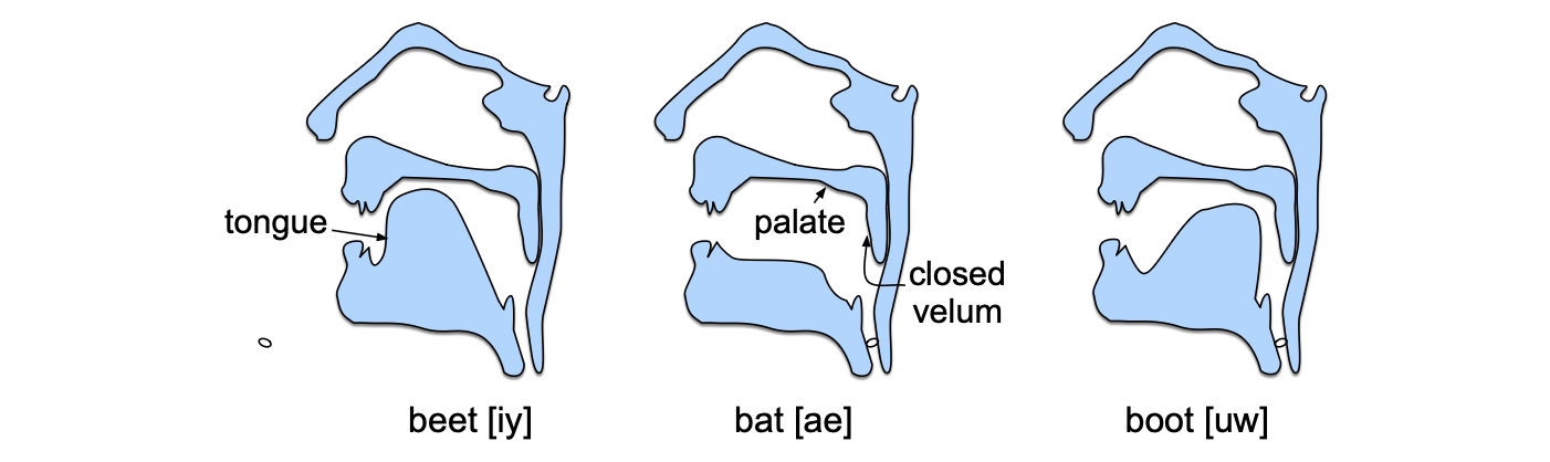 例如,在元音 [iy] 中,舌头的最高点位于口腔前部。 相比之下,在元音 [uw] 中,舌头的最高点位于口腔后部。 将舌头抬升到口腔前部的元音称为前元音(front vowels);而将舌头抬升到口腔后部的元音则称为后元音(back vowels)。 请注意,尽管 [ih] 和 [eh] 都是前元音,但 [ih] 中舌头的位置比 [eh] 更高。 舌头最高点相对较高的元音称为高元音(high vowels);舌头最高点处于中等或较低位置的元音则分别称为中元音(mid vowels) 或低元音(low vowels)。