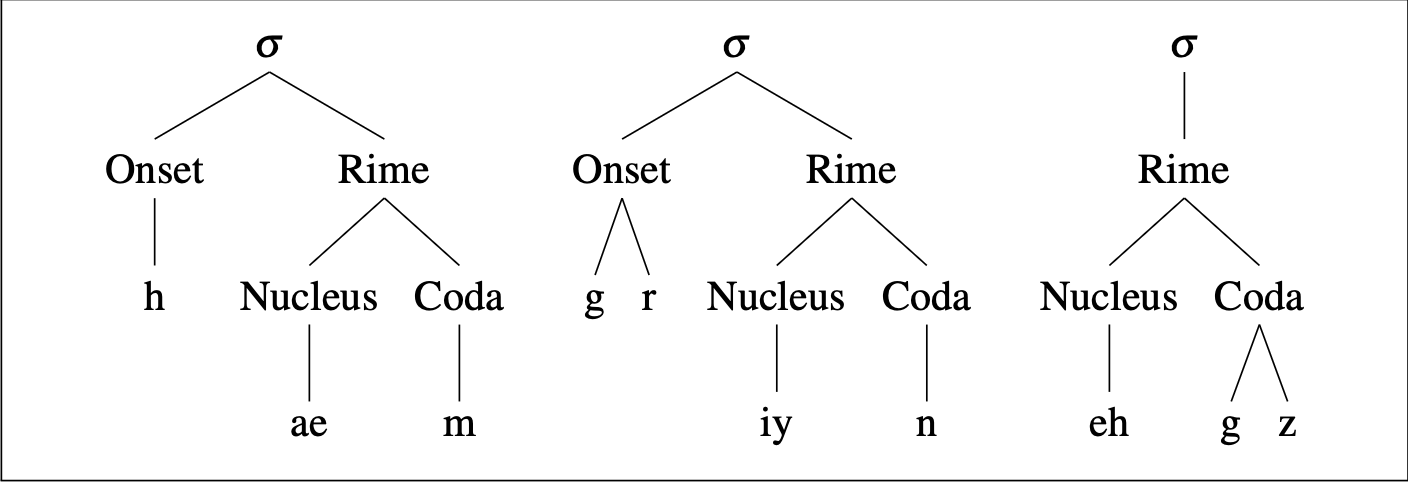 将单词自动拆分为音节的任务称为音节划分(syllabification)。 音节结构也与一种语言的音位组合规则(phonotactics) 紧密相关。 术语音位组合规则(phonotactics) 指的是在一个语言中,哪些音位可以彼此跟随的限制。 例如,英语对哪些辅音可以在声首中共同出现有很强的限制;例如,序列 [zdr] 就不能作为合法的英语音节声首。 音位组合规则可以通过语言模型或有限状态模型来表示音位序列。