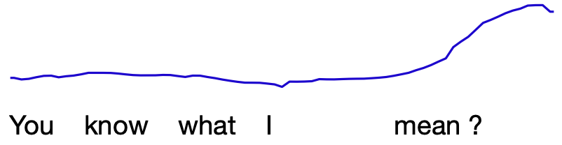 即使两个话语具有相同的重音模式和韵律短语结构,它们仍可能因语调(tune) 不同而在韵律上有所区别。 话语的语调是指其基频(F0)随时间变化的升降模式。 一个非常明显的例子是英语中陈述句与是非疑问句(yes-no questions)之间的区别。 同样的词语,若在句末 F0 上升,则表示是非疑问句(这种上升称为疑问升调(question rise)):