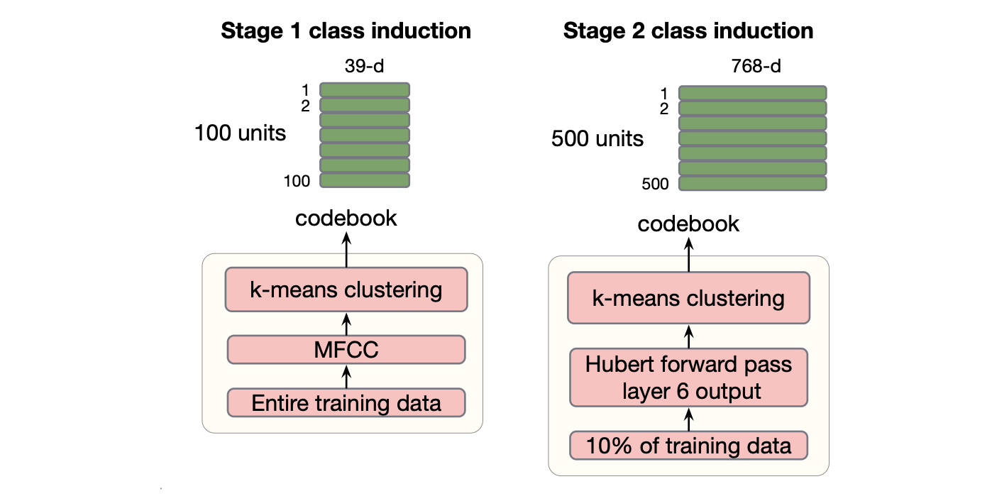 图15.10 创建两个阶段的HuBERT训练目标。 在第一阶段,计算整个训练数据的 39 维 MFCC 向量,然后用 k-means 进行聚类,创建了100个声学单元。 在第二阶段,将训练数据的一个子样本经过第一阶段训练后的 HuBERT 模型,取中间Transformer层(第6层)的输出,并用 k-means 进行聚类,从而创建 500 个单元。