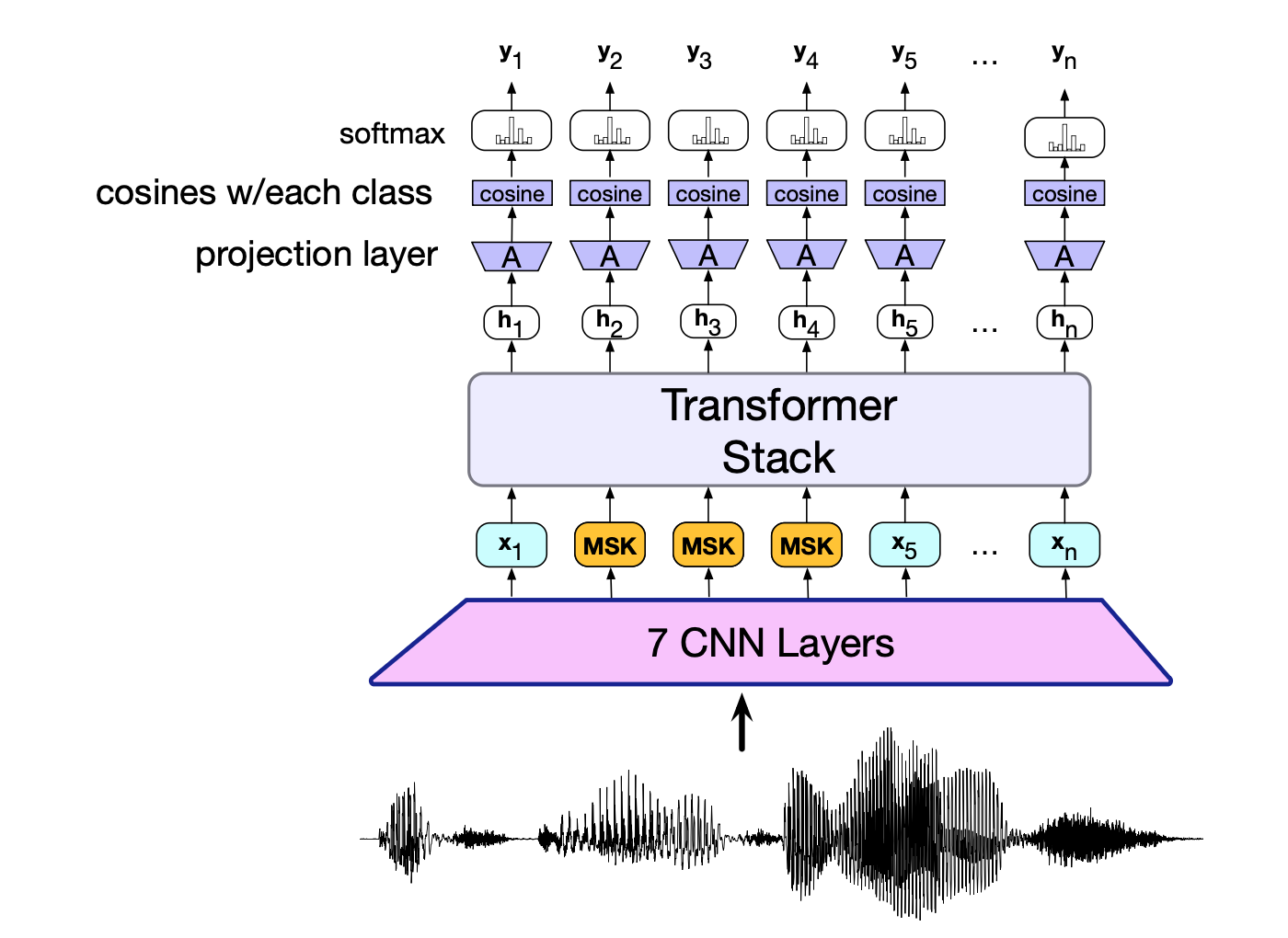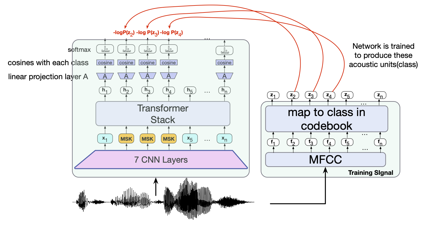 现在考虑整个训练过程。 在声学输入通过 CNN 层之后,选择上下文窗口中的一段 token 进行掩码处理,这些标记的 CNN 输出被 MASK 嵌入所替代。 整个上下文窗口随后通过 Transformer 层,每一时间步 $t$ 处的 Transformer 输出 $h^L_t$ 乘以投影层矩阵 $\mathbf{A}$ 以将其映射到类别嵌入空间。 得到的表示形式然后与集合 $C$ 中的每个类别的嵌入(使用余弦相似度)进行比较,使用 softmax(温度参数 $\tau=0.1$)将相似度转化为概率: