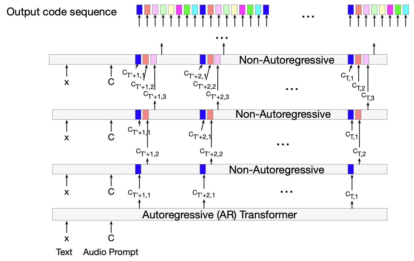 如图 16.8 所示,在左侧我们有一个音频样本及其转录文本,并且二者都进行了词元化处理。 然后我们在文本 $\mathbf{x}$ 的末尾附加 [EOS] 和 [BOS] 标记,在音频代码矩阵 $\mathbf{C}$ 的末尾附加 [EOS] 标记,接着训练自回归变换器从 $c_{0,1}$ 开始预测声学标记直到 [EOS] 出现。随后,非自回归变换器用于填充其余的标记。