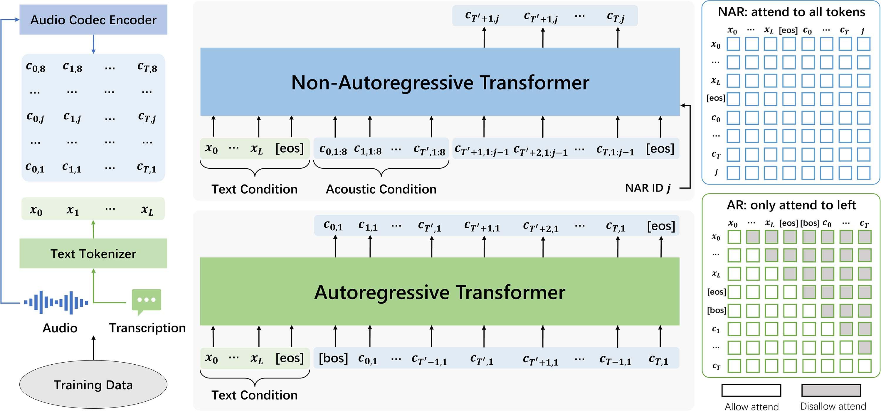下面我们更详细地介绍该架构。 在训练阶段,给定一段音频样本 $\mathbf{y}$ 及其对应的词元化后文本转录 $\mathbf{x} = [x_0, x_1, \dots, x_L]$。我们使用一个预训练好的 ENCODEC 模型将 $\mathbf{y}$ 转换为一个词元矩阵 $\mathbf{C}$。设 ENCODEC 输出的下采样向量数量为 $T$,每个向量对应 8 个 RVQ 词元,则编码器输出可表示为: