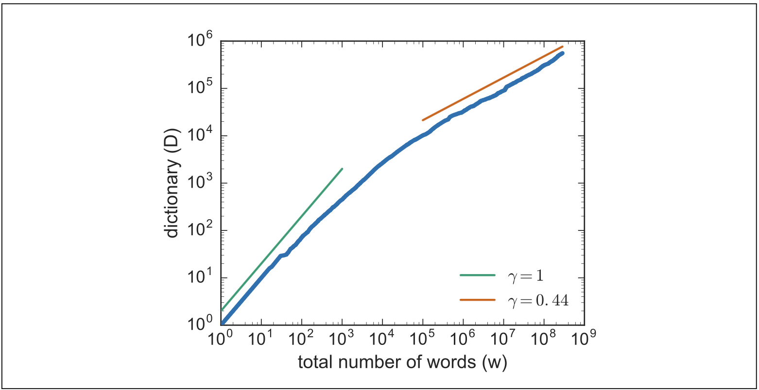 图 2.2 基于公开 Gutenberg 图书语料库计算的词汇量随文本长度的变化关系。引自 Tria 等(2018)。