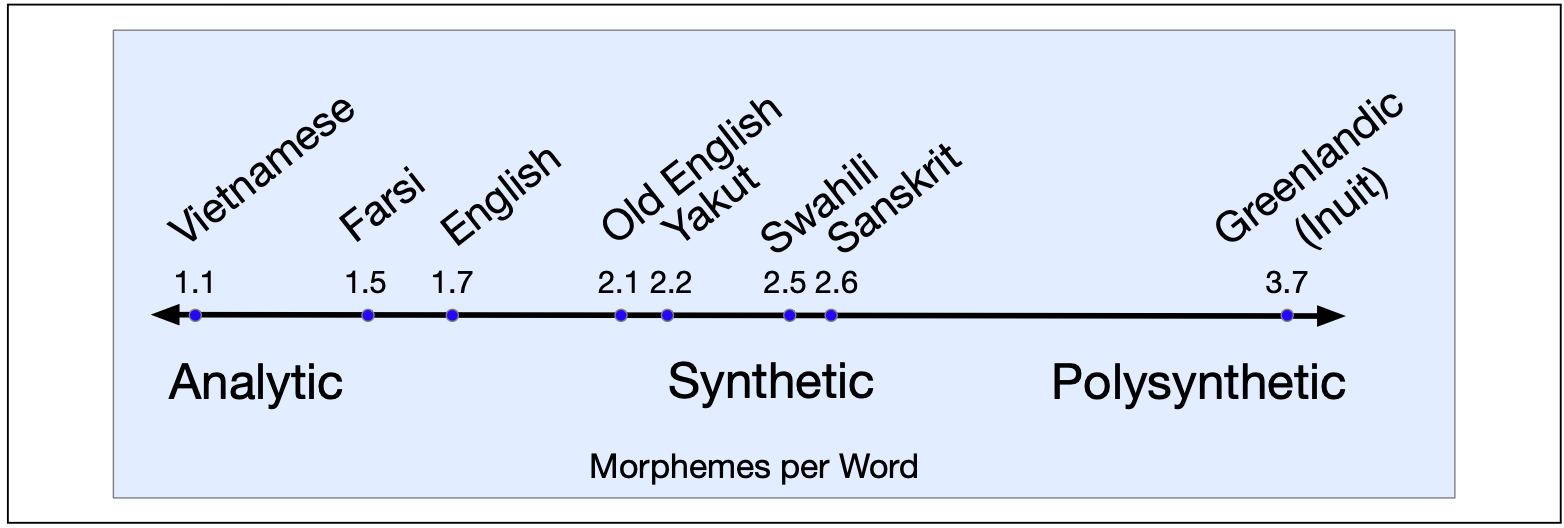 相反,在诸如科里亚克语(Koryak)这样的语言中(一种通行于俄罗斯堪察加半岛北部的楚科奇–堪察加语系语言),单个词可能包含大量语素,其表达的内容相当于英语中的一个完整句子(Arkadiev, 2020;Kurebito, 2017)。 我们将这类语言称为综合型语言(synthetic languages),而处于该谱系最极端的一端则称为多式综合型语言(polysynthetic languages)。