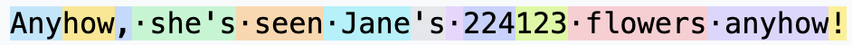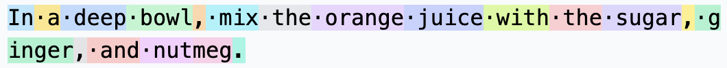 图中用不同颜色区分单词,但请注意:分词器的真实输出只是一串唯一的词元 ID。 (如果你感兴趣,这句共包含以下 13 个词元 ID:11865, 8923, 11, 31211, 6177, 23919, 885, 220, 19427, 7633, 18887, 147065, 0)