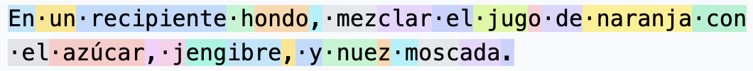 当前大多数大语言模型使用的分词器都是多语言的,在多种语言数据上联合训练。 但由于大语言模型的训练数据在很大程度上以英文文本为主,这些多语言 BPE 分词器往往会将大部分词元用于英语,留给其他语言的词元就相对较少。 其后果是英语分词效果较好,其他语言的词常被切分为更短的词元。 例如,下面是一句来自大蕉食谱的西班牙语句子及其英文翻译: