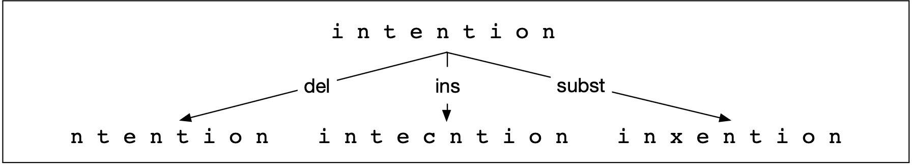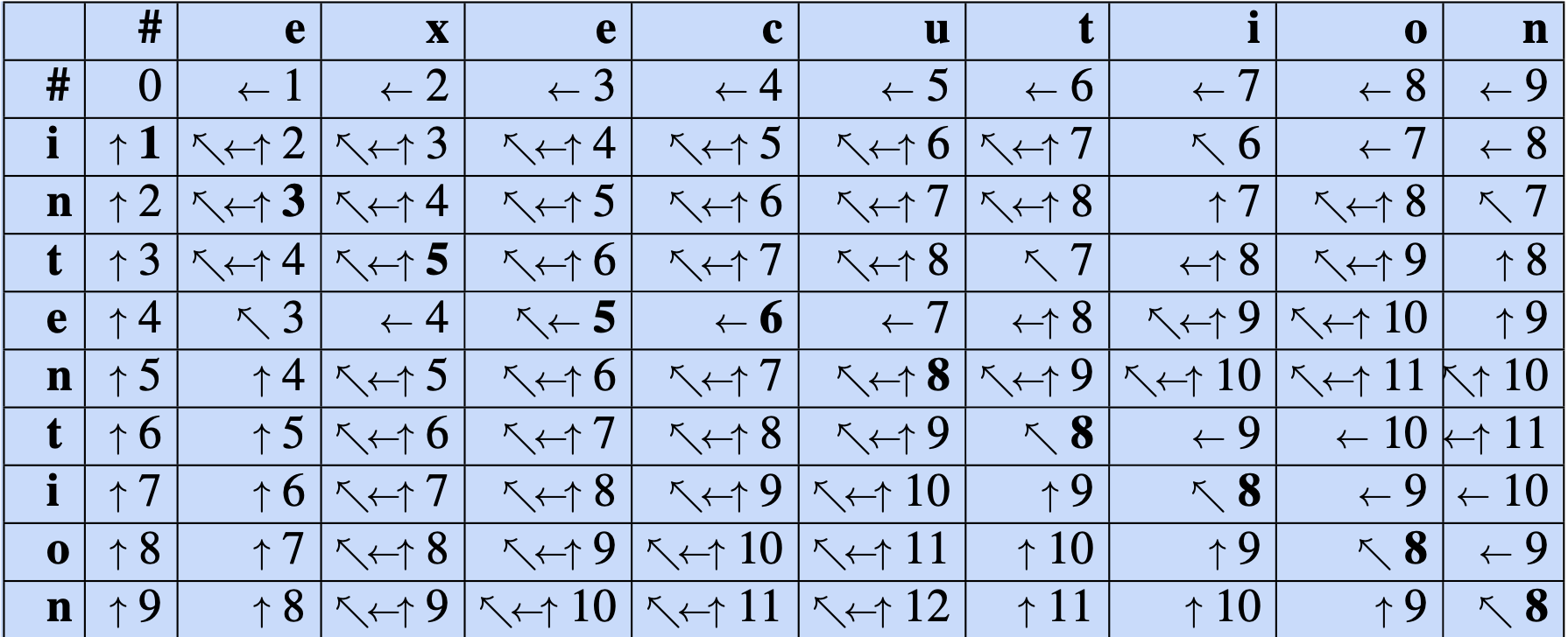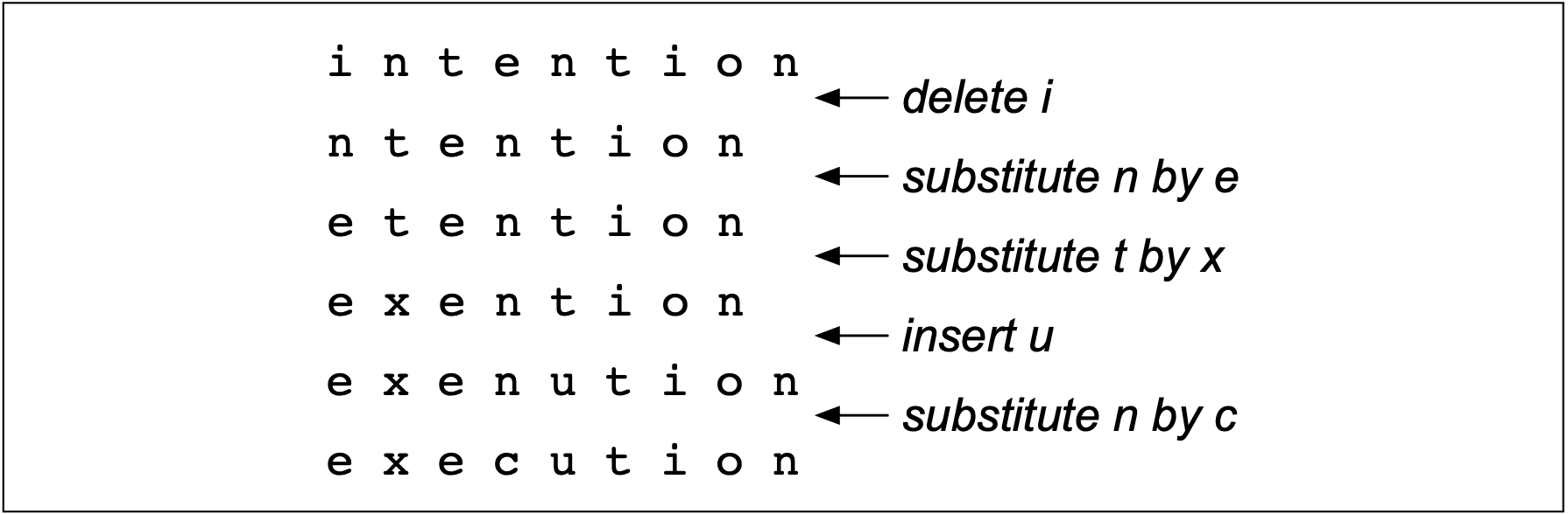 例如,“intention”与“execution”之间的差距为 5(删除一个 i,将 n 替换为 e,将 t 替换为 x,插入 c,将 n 替换为 u)。