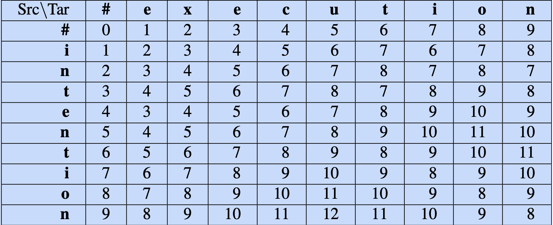 图 2.20 使用图 2.19 的算法计算 intention 与 execution 之间的最小编辑距离,采用莱文斯坦距离,插入和删除操作代价为1,替换操作代价为2。