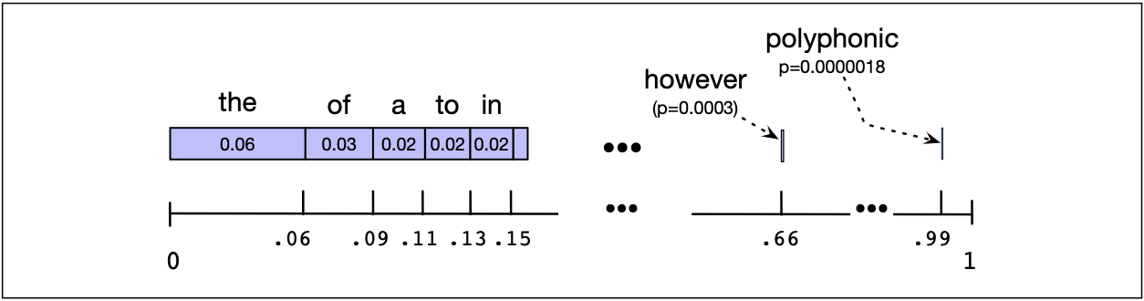 图 3.3 展示了通过不断采样 unigram 来生成句子时的采样分布。 蓝色条形图表示每个词的相对频率(按从高频到低频的顺序排列,但顺序本身是任意的)。 数轴显示了累积概率。如果随机选择一个介于 0 和 1 之间的数字,它会落在某个词所对应的区间内。 我们更有可能随机选中高频词(如 the、of、a)所对应的较大区间,而不太可能选中低频词(如 polyphonic)所对应的小区间。