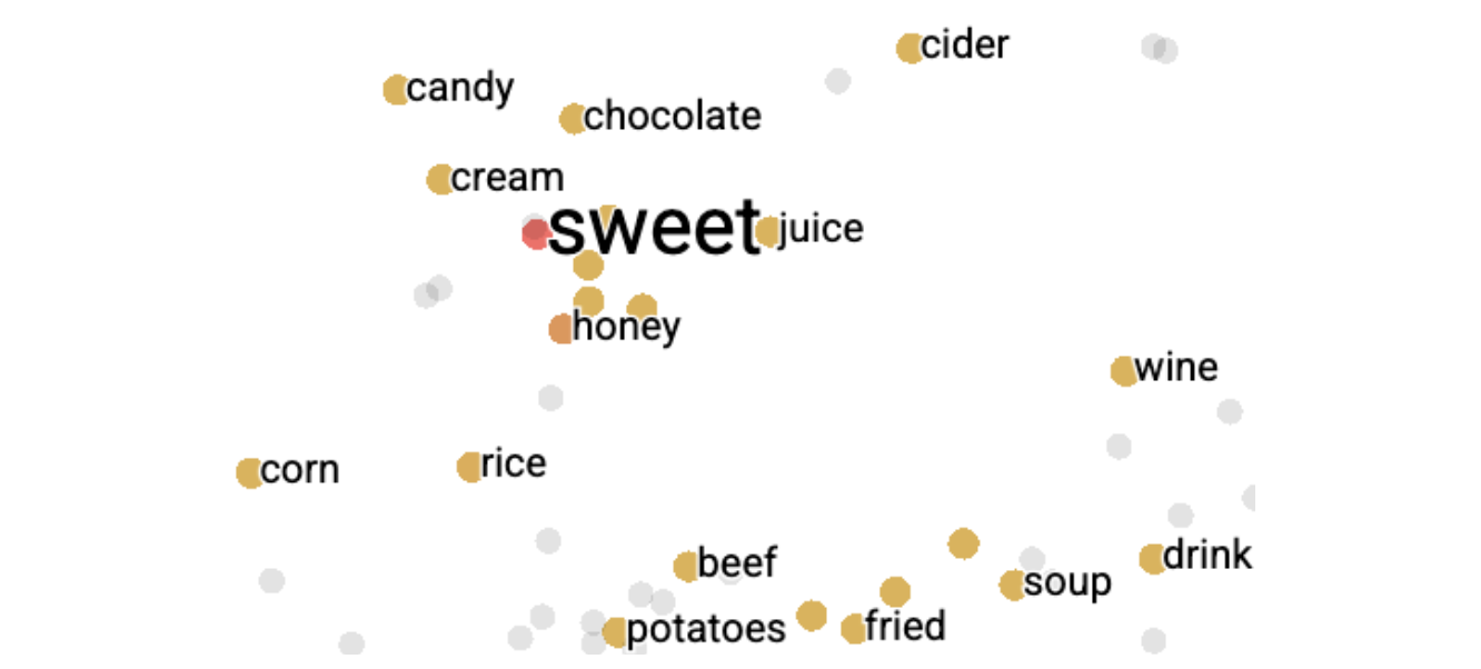 图5.1 对“sweet”附近部分词语的 200 维 word2vec 嵌入进行二维(t-SNE)可视化。图中可见,语义相近的词在空间中彼此靠近。