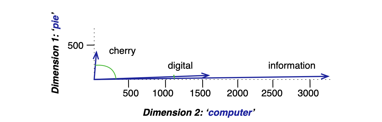 图 5.5:余弦相似度的(粗略)图示。图中展示了三个词(cherry、digital、information)在由邻近词 computer 和 pie 的频次所定义的二维空间中的向量。 图中未直接显示余弦值,但突出了向量之间的夹角;注意,digital 与 information 之间的夹角,小于 cherry 与 information 之间的夹角。 当两个向量越相似,它们的余弦值越大,夹角越小;当夹角为最小值 0° 时,余弦达到最大值 1;其他所有角度的余弦值均小于 1。