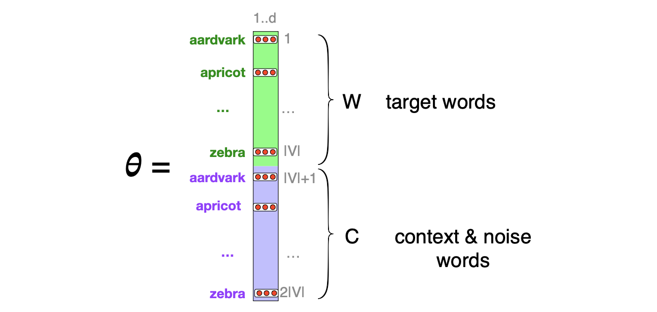 图 5.6 Skip-gram 模型所学习的嵌入向量。 该算法为每个词存储两个嵌入向量:目标嵌入(有时称为输入嵌入)和上下文嵌入(有时称为输出嵌入)。 算法所学习的参数 $\theta$ 因此是一个由 $2|V|$ 个向量组成的矩阵,每个向量维度为 $d$,它通过将两个矩阵拼接而成:目标嵌入矩阵 $\mathbf{W}$ 和上下文-噪声嵌入矩阵 $\mathbf{C}$。
