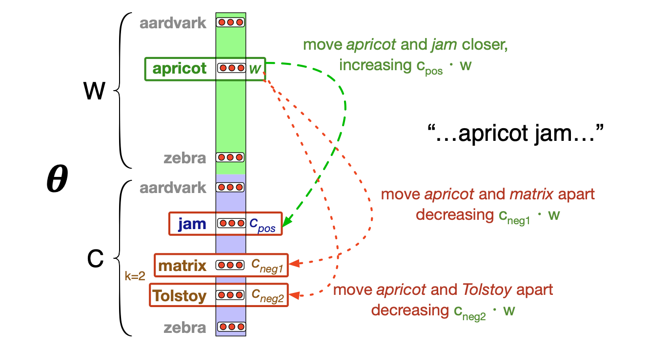 $$ \begin{align*} c^{t+1}_{pos} &= c^t_{pos} − \eta[\sigma(c^t_{pos} \cdot \mathbf{w}^t) − 1]\mathbf{w}^t \tag{5.25} \\ c^{t+1}_{neg} &= c^t_{neg} − \eta[\sigma(c^t_{neg} \cdot \mathbf{w}^t)]\mathbf{w}^t \tag{5.26} \\ w^{t+1} &= w^t − \eta[[\sigma(c^t_{pos} \cdot \mathbf{w}^t) − 1]c^t_{pos} + \sum^k_{i=1}[\sigma(c^t_{neg_i} \cdot \mathbf{w}^t )]c^t_{neg_i}] \tag{5.27} \end{align*} $$因此,与逻辑回归类似,该学习算法首先对 $\mathbf{W}$ 和 $\mathbf{C}$ 矩阵进行随机初始化,然后遍历训练语料库,使用梯度下降法调整 $\mathbf{W}$ 和 $\mathbf{C}$,通过执行公式 (5.25) 到 (5.27) 的更新,以最小化公式 5.21 中的损失函数。