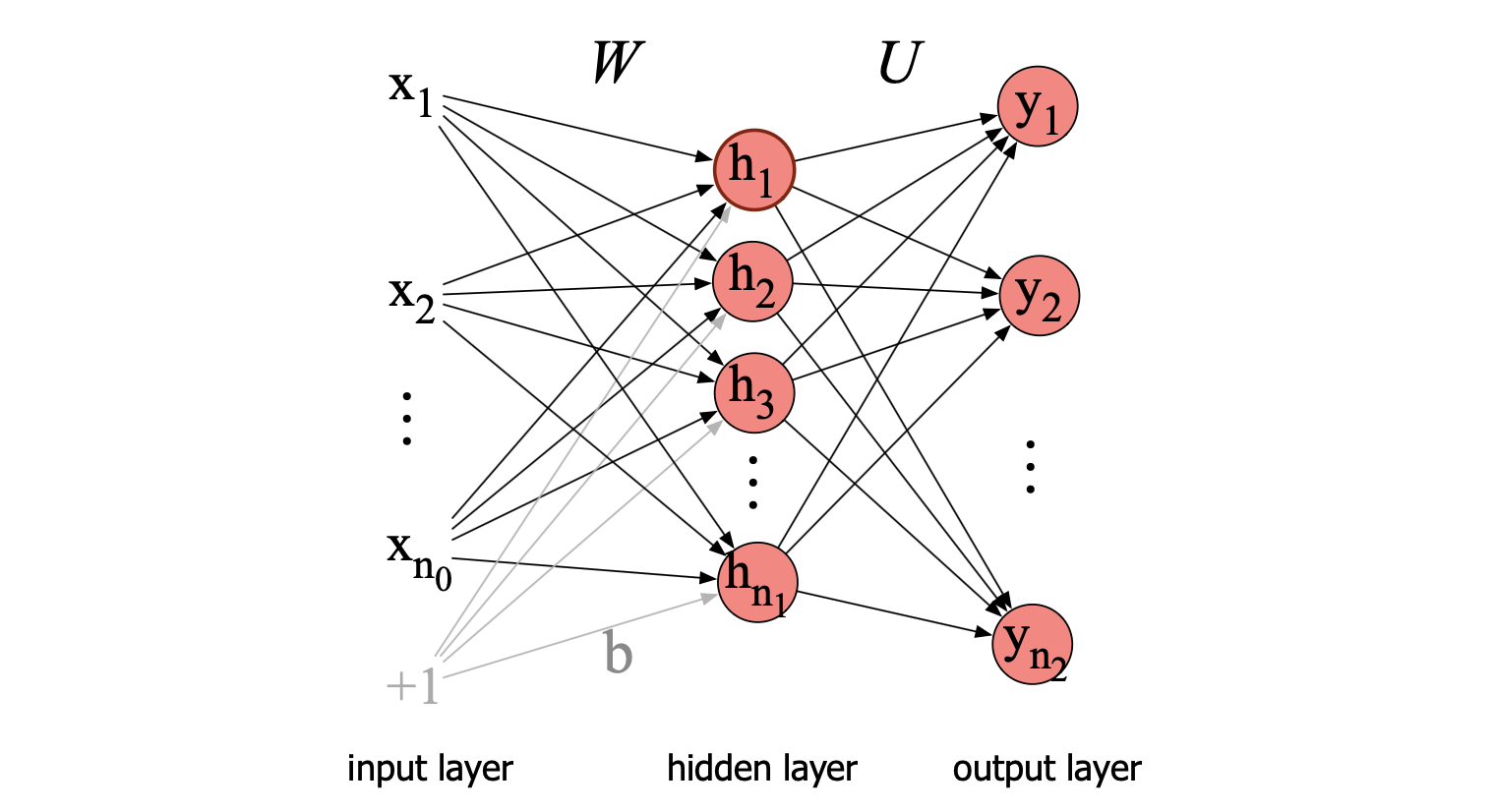 以下是单隐藏层前馈网络的完整计算公式:输入向量为 $\mathbf{x}$;输出为概率分布 $\mathbf{y}$;参数包括权重矩阵 $\mathbf{W}$、$\mathbf{U}$ 和偏置向量 $\mathbf{b}$: