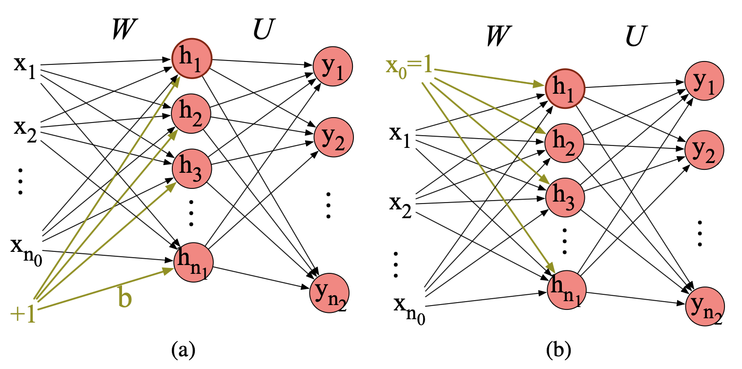 图 6.9 偏置节点的两种表示方式:(a) 显式偏置节点;(b) 用 $x_0 = 1$ 替代。