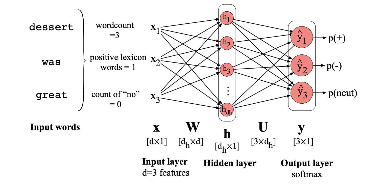 输入元素 $\mathbf{x}_i$ 可以是图 4.2 中那样的标量特征,例如$\mathbf{x}_i$ = 文档中的总词数,$\mathbf{x}_2$ = 文档中积极情感词典词的出现次数,如果文档包含“no” 则 $\mathbf{x}_3$ = 1,依此类推,共 $d$ 个特征。 输出层 $\hat{y}$ 可以有两个节点(分别对应正面、负面情感),或三个节点(正面、负面、中性)。此时 $\hat{y}_1$ 表示正面情感的概率, $\hat{y}_2$ 表示负面情感的概率,$\hat{y}_3$ 表示中性情感的概率。 整个模型的计算公式与前述两层网络完全一致(如前所述,我们继续用 $\sigma$ 泛指任意非线性激活函数,无论是 Sigmoid、ReLU 还是其他):