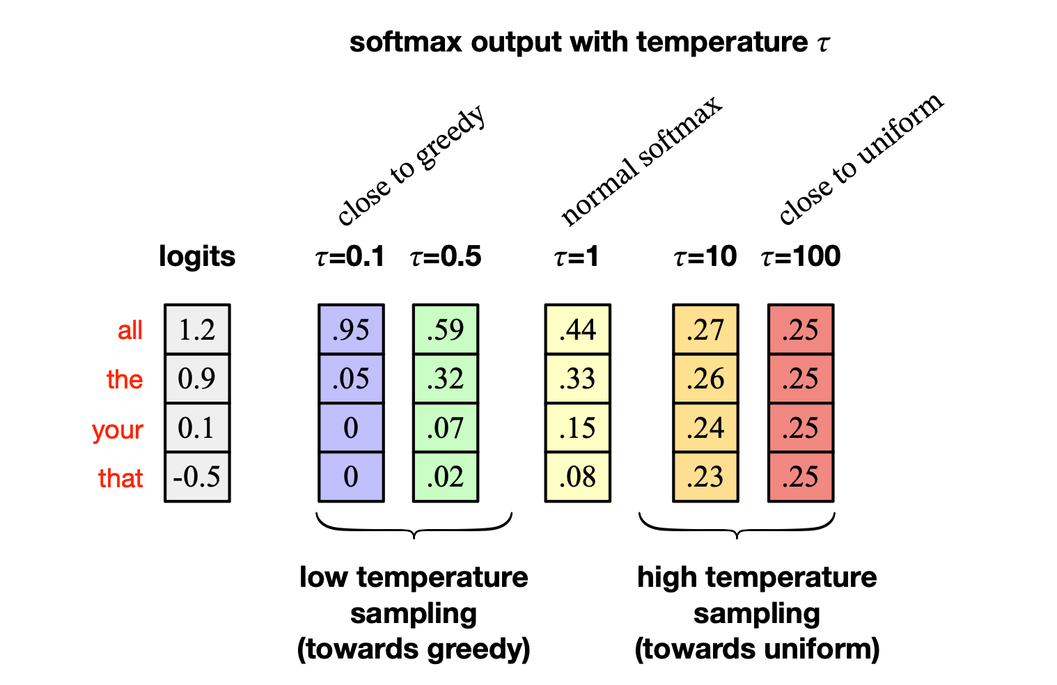 $$ \mathbf{y} = \text{softmax}(\mathbf{u}) \tag{7.3} $$而在温度采样中,我们首先将 logits 除以 $\tau$,再计算概率向量 $\mathbf{y}$: