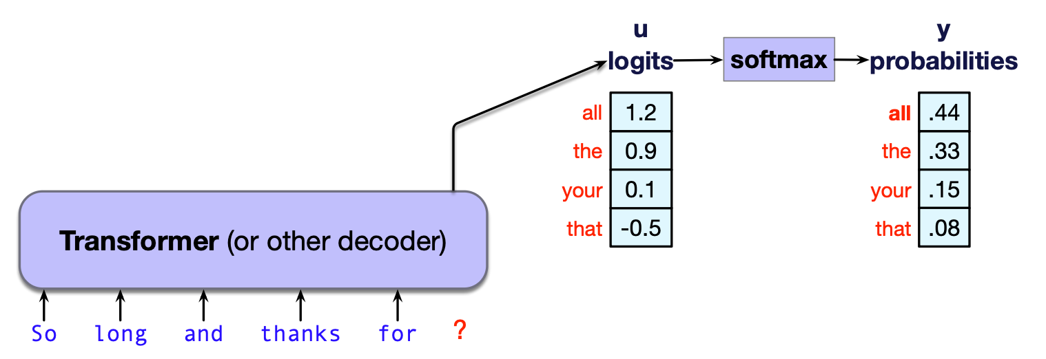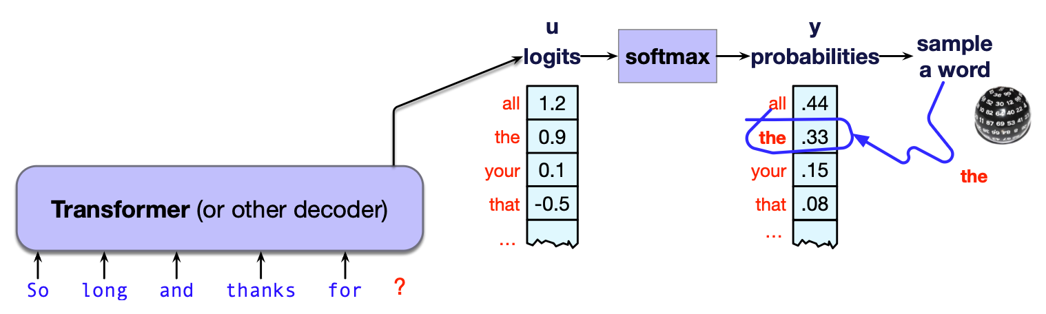 生成结果取决于每个词元的概率,所以我们先回顾一下这个概率分布的来源。 语言模型的内部网络(无论是 Transformer,还是 LSTM、状态空间模型等替代架构)会为词汇表中的每个词元生成一个称为logit 的得分(实数值)。 这个得分向量 $\mathbf{u}$ 随后通过 softmax 函数归一化,形成一个合法的概率分布——正如我们在第 4 章逻辑回归中所见。 所以,如果我们有一个形状为 $[1 \times |V|]$ 的 logit 向量 $\mathbf{u}$,其中每个元素对应一个可能的下一个词元的得分,那么将其通过 softmax 函数即可得到一个同样形状为 $[1 \times |V|]$ 的概率向量 $\mathbf{y}$,该向量为词汇表中每个词元分配一个概率,如下公式所示: