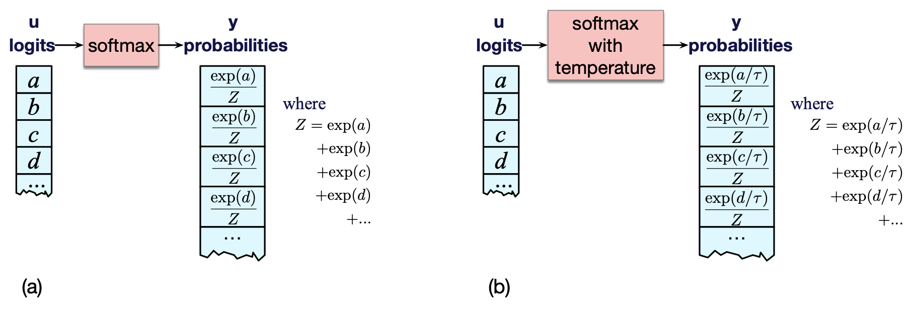 $$ \mathbf{y} = \text{softmax}(\mathbf{u}/\tau) \tag{7.4} $$也就是说,正常情况下,我们如图 7.10(a) 所示,直接对 logits 应用 softmax。 但使用温度参数时,我们先对 logits 进行缩放,如图 7.10(b) 所示。