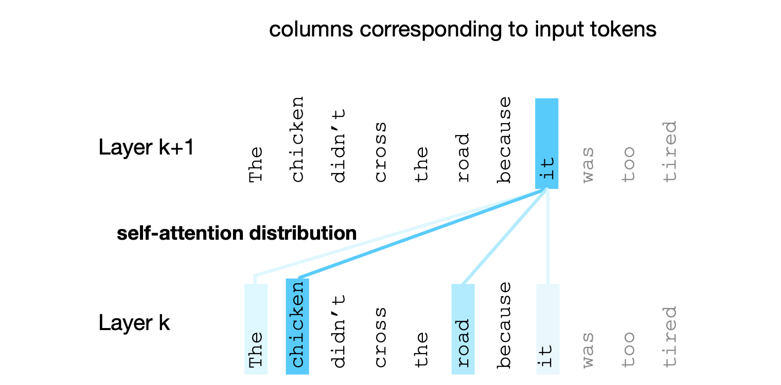 图 8.2 展示了在第 $k+1$ 层计算代词 it 的表示时所涉及的自注意力权重分布 $\alpha$。