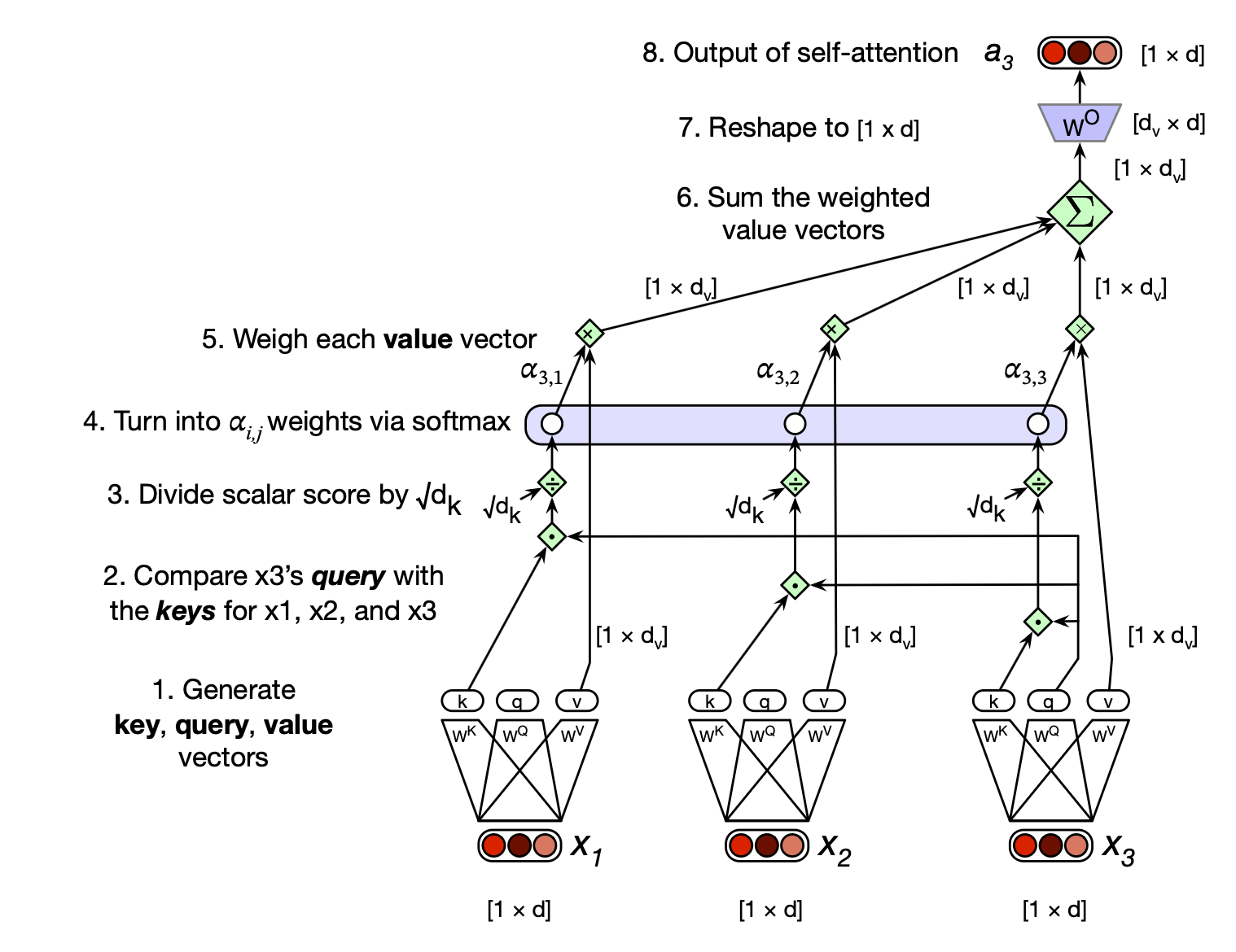 $$ \begin{align*} \mathbf{q}_i = \mathbf{x}_i \mathbf{W^Q}; \mathbf{k}_j &= \mathbf{x}_j \mathbf{W^K}; \mathbf{v}_j = \mathbf{x}_j \mathbf{W^V} \tag{8.10} \\ \mathrm{score}(\mathbf{x}_i, \mathbf{x}_j) &= \frac{\mathbf{q}_i \cdot \mathbf{k}_j}{\sqrt{d_k}} \tag{8.11} \\ \alpha_{ij} &= \text{softmax}(\text{score}(\mathbf{x}_i, \mathbf{x}_j)) \quad \forall j \leq i \tag{8.12} \\ \mathbf{head}_i &= \sum_{j \leq i} \alpha_{ij} \mathbf{v}_j \tag{8.13} \\ \mathbf{a}_i &= \mathbf{head}_i \mathbf{W}^{\mathbf{O}} \tag{8.14} \end{align*} $$图 8.4 展示了在序列中计算第三个输出 $\mathbf{a}_3$ 的过程。