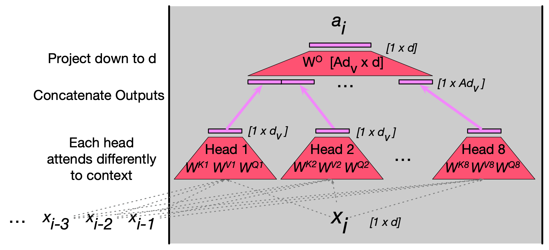 $$ \begin{align*} \mathbf{q}^c_i = \mathbf{x}_i \mathbf{W^Qc}; \mathbf{k}^c_j = \mathbf{x}_j \mathbf{W_Kc}; \mathbf{v}^c_j &= \mathbf{x}_j \mathbf{W_Vc}; \quad \forall\, 1 \leq c \leq h \tag{8.15} \\ \mathrm{score}^c(\mathbf{x}_i, \mathbf{x}_j) &= \frac{\mathbf{q}^c_i \cdot \mathbf{k}^c_j}{\sqrt{d_k}} \tag{8.16} \\ \alpha^c_{ij} &= \text{softmax}\big(\text{score}^c(\mathbf{x}_i, \mathbf{x}_j)\big) \quad \forall j \leq i \tag{8.17} \\ \text{head}^c_i &= \sum_{j \leq i} \alpha^c_{ij} \mathbf{v}^c_j \tag{8.18} \\ \mathbf{a}_i &= \big( \text{head}^1_i \oplus \text{head}^2_i \oplus \cdots \oplus \text{head}^A_i \big) \mathbf{W}^{O} \tag{8.19} \\ \mathrm{MultiHeadAttention}\big(\mathbf{x}_i, [\mathbf{x}_1, \dots, \mathbf{x}_N]\big) &= \mathbf{a}_i \tag{8.20} \end{align*} $$注意,在公式 (8.20) 中,MultiHeadAttention 是当前输入 $\mathbf{x}_i$ 以及所有其他输入的函数。