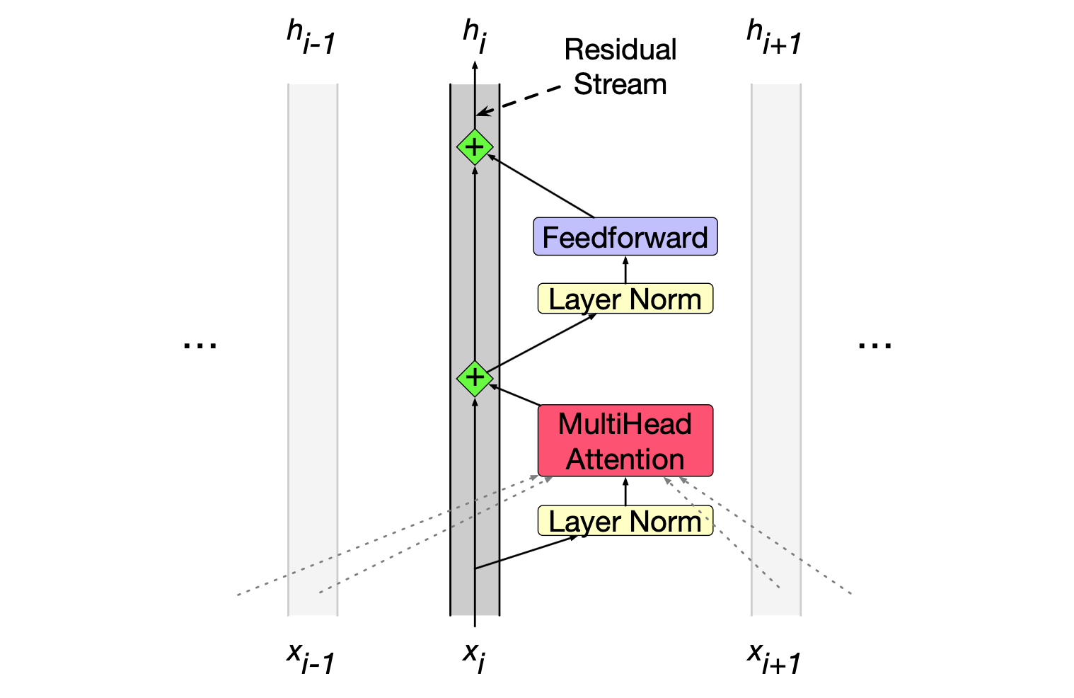 初始向量首先经过一层归一化和注意力层,其结果被加回到残差流中——在此处,是加到原始输入向量 $\mathbf{x}_i$ 上。 随后,这个求和后的向量再次经过另一层归一化和一个前馈层,其输出又被加回到残差流中。 我们将最终得到的输出记为 $\mathbf{h}_i$,表示词元 $i$ 经过整个 Transformer 块后的结果。 (早期描述常将这一机制比喻为残差连接——即将某个组件的输入与其输出相加。但残差流这一视角能更清晰地展现 Transformer 的信息流动方式。)