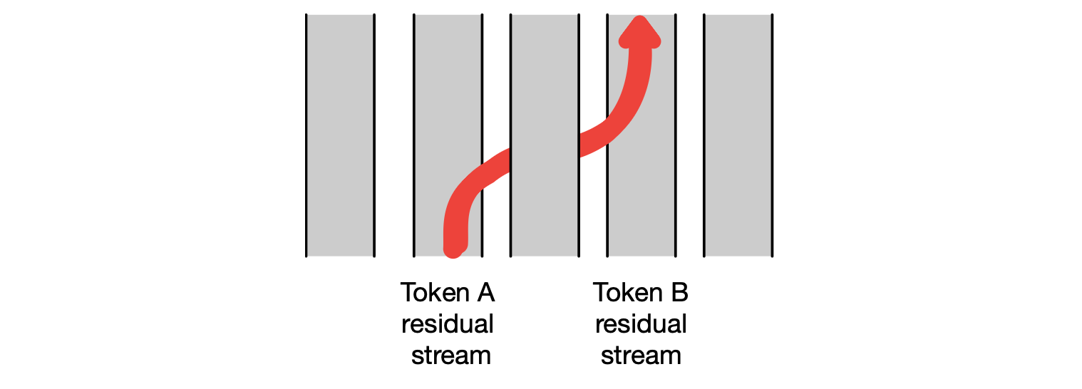 图 8.7 一个注意力头可以将词元 A 的残差流中的信息“移动”到词元 B 的残差流中。