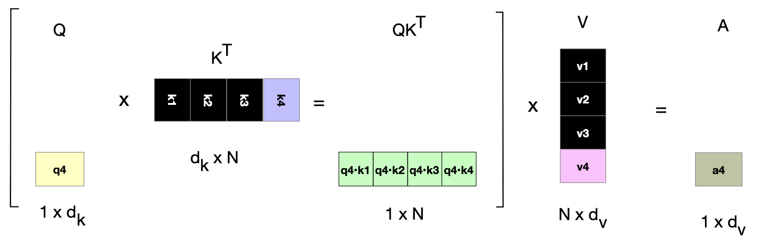 图 8.17 注意力计算的部分流程(摘自图 8.10),以黑色标出在计算第 4 个词元的注意力分数时,可以从缓存中直接获取(而非重新计算)的 Key 和 Value 向量。