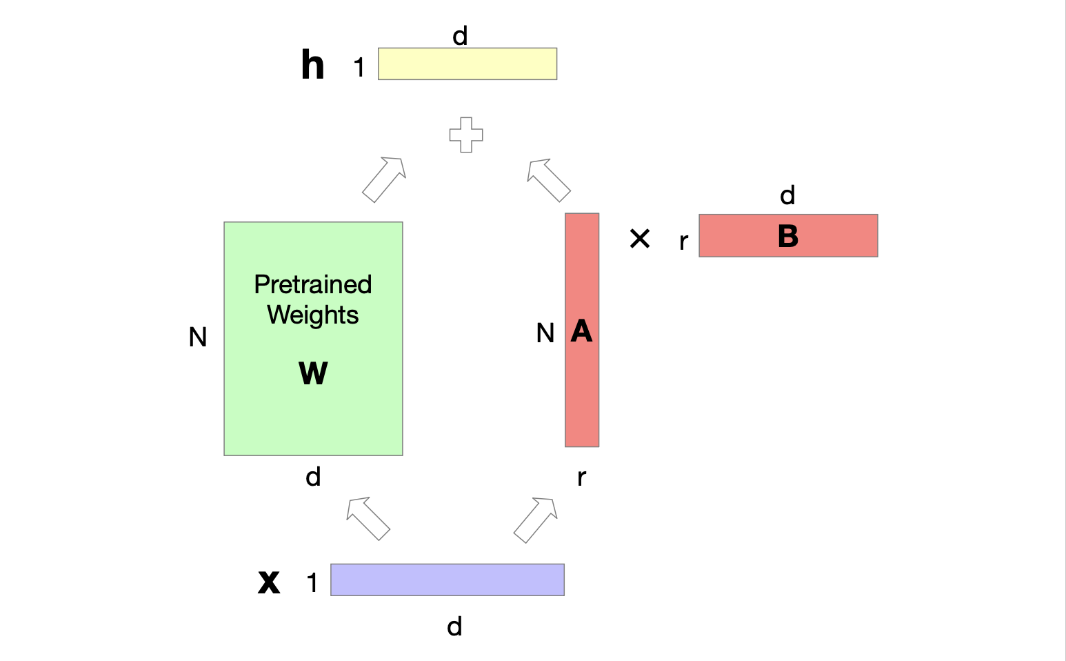考虑一个维度为 $[N \times d]$ 的矩阵 $\mathbf{W}$,在微调过程中需通过梯度下降更新。 通常情况下,这个矩阵会得到维度为 $[N \times d]$ 的更新 $\delta \mathbf{W}$,用于梯度下降后更新 $N \times d$ 个参数。 在 LoRA 中,我们冻结 $\mathbf{W}$ 并改为更新 $\mathbf{W}$ 的低秩分解。 我们创建两个矩阵 $\mathbf{A}$ 和 $\mathbf{B}$,其中 $\mathbf{A}$ 的大小为 $[N \times r]$,$\mathbf{B}$ 的大小为 $[r \times d]$,并且我们选择 $r$ 相当小,满足 $r << min(d,N)$。 在微调期间,我们更新的是 $\mathbf{A}$ 和 $\mathbf{B}$ 而不是 $\mathbf{W}$。 也就是说,我们将 $\mathbf{W} + \delta \mathbf{W}$ 替换为 $\mathbf{W} + \mathbf{BA}$。 图 8.18 展示了这一思想。 对于替换前向传递 $\mathbf{h} = \mathbf{xW}$,新的前向传递变为: