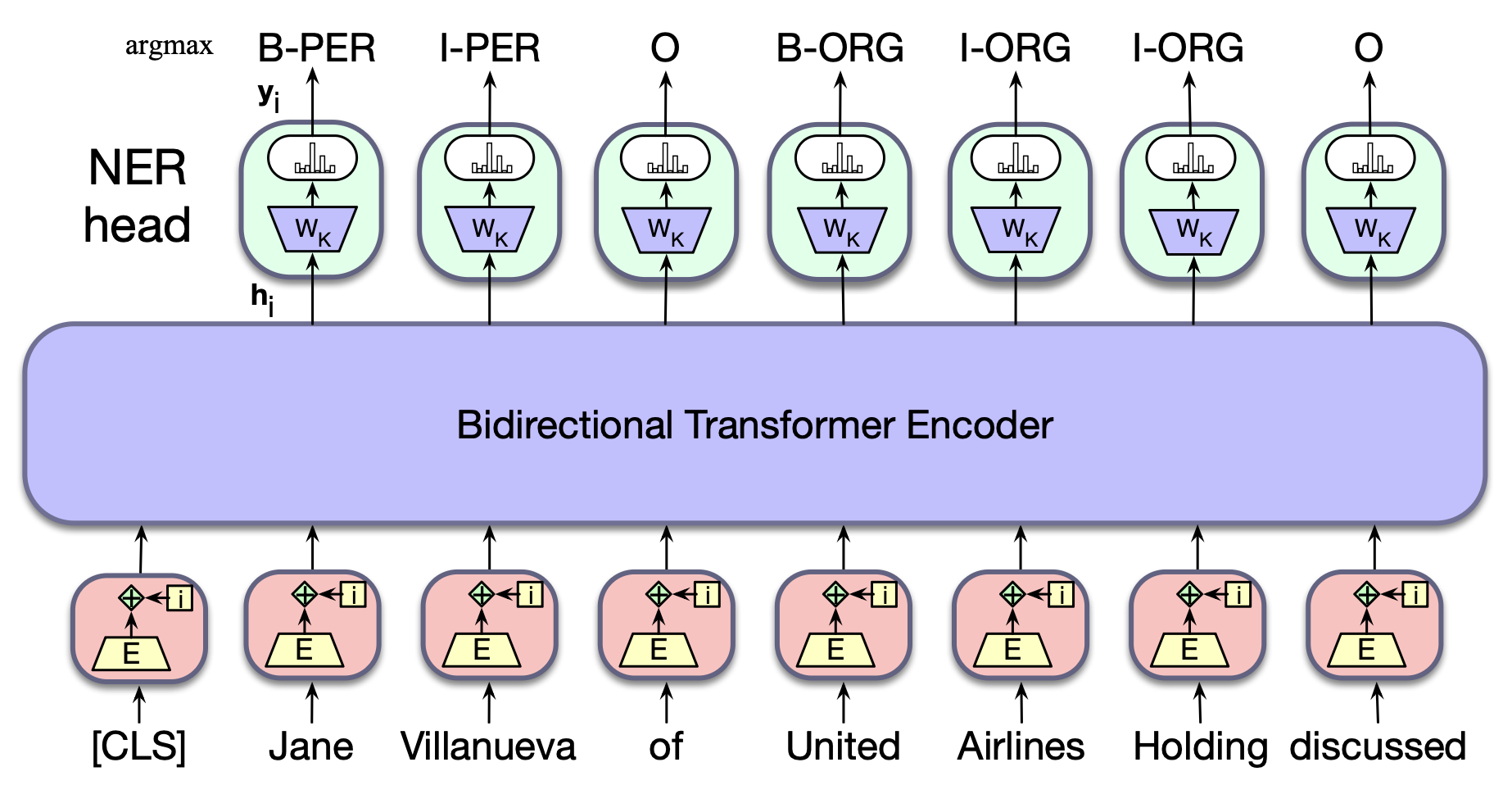 图 9.13 使用双向 Transformer 编码器进行命名实体识别的序列标注架构。 每个输入词元的输出向量被送入一个简单的 $k$ 路分类器,以预测其对应的标签。